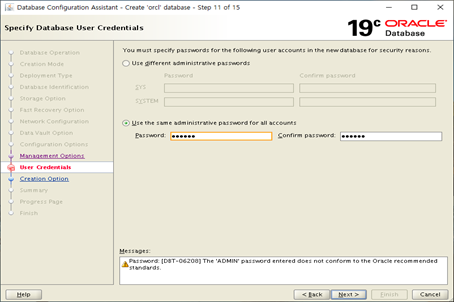 Oracle 관리자 계정들에 대한 패스워드를 설정하는 화면이다.