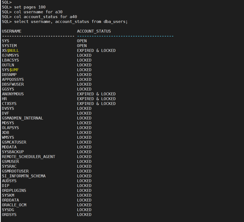 기본적으로 sys, system 계정을 제외하고 모든 계정은 잠겨있다.