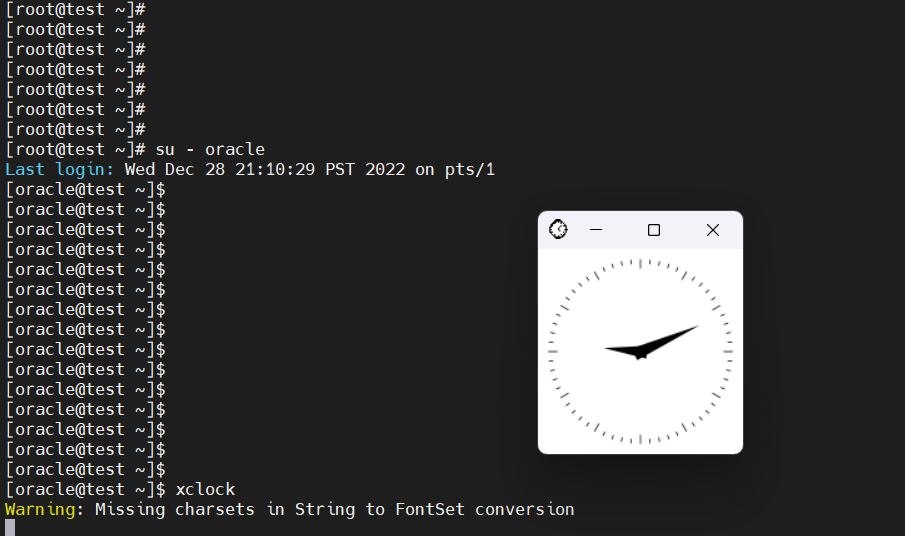 이 후 실행하면 정상적으로 user계정에서도 xclock을 사용할 수 있는 모습을 볼 수 있다.